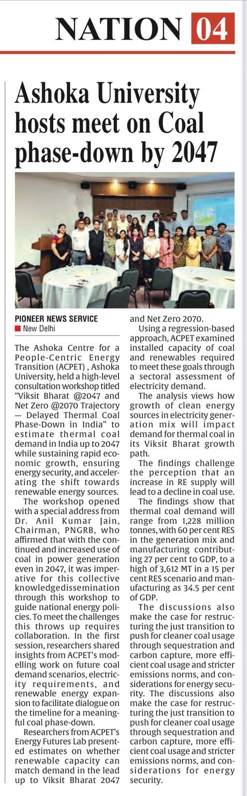 Media Coverage: The Pioneer – “Ashoka University hosts meet on Coal phase-down by 2047”